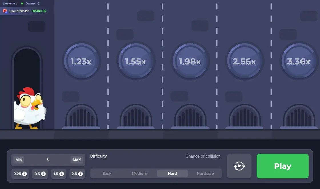 - Hardcore – multiplicatori care pot urca rapid spre 5x–20.000x, dar șansa de a pierde la primul pas este mult mai mare.